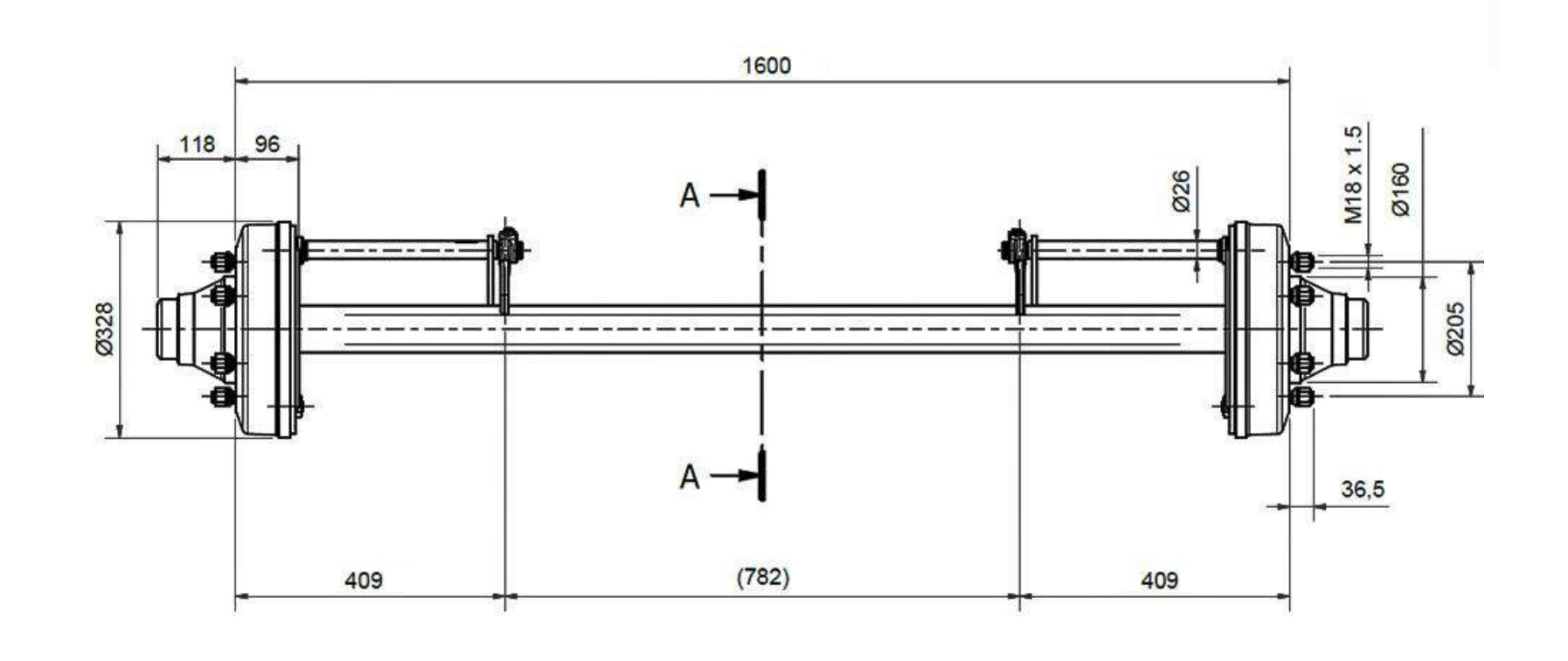AKSEL TIL TRAILER MED BREMSER (6 SKRUER) - 7200 kg - 1600 mm