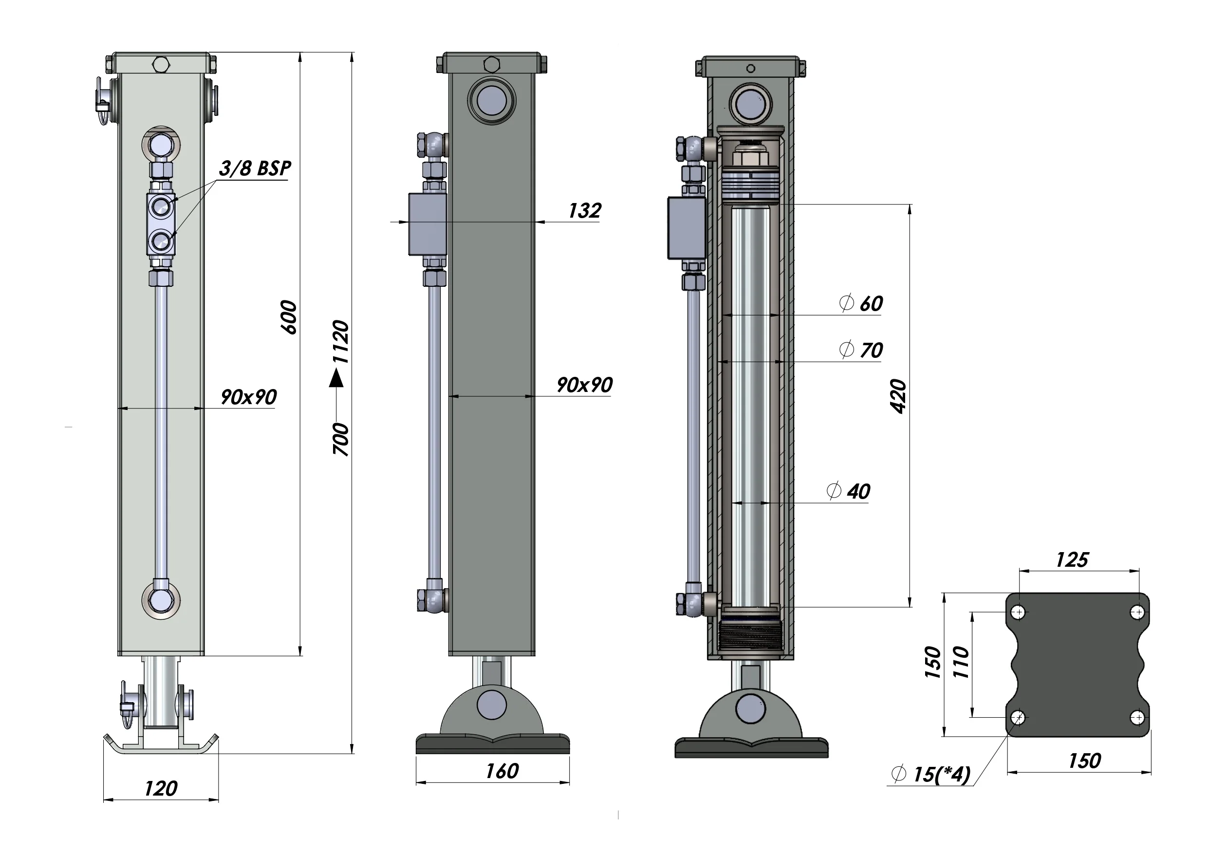 DOBBELTVIRKENDE HYDRAULISK STØTTEBEN (90x90x700 mm) - SLAGLÆNGDE 420 mm - 2.500 kg