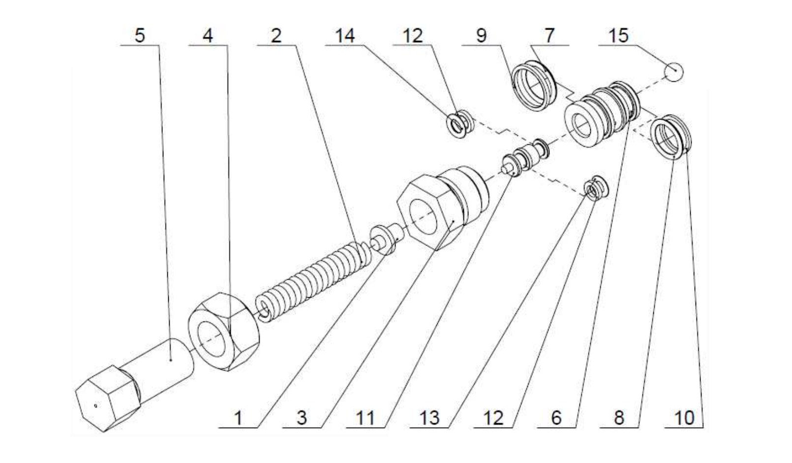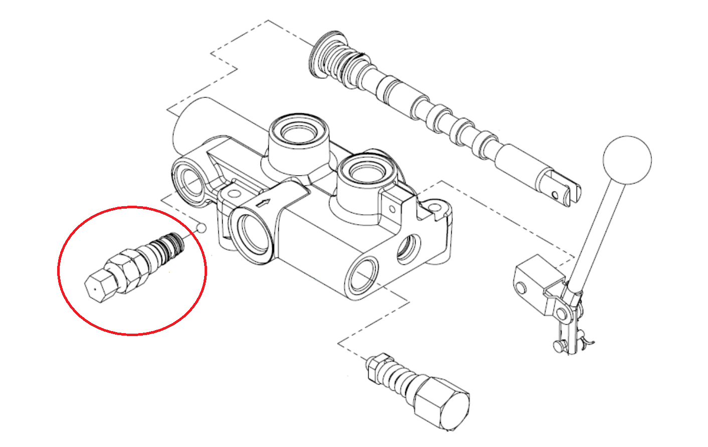 Trykaflastningspinden muliggør et trykaflastningssystem (automatisk tilbageføring af betjeningshåndtaget til neutralpositionen). Når slæden bevæger sig ind i trykaflastningssystemet, bliver olien ført til "B" arbejdsporten (væk fra håndtaget). Når trykket i port "B" overstiger den indstillede værdi, frigør trykaflastningspinden betjeningshåndtaget tilbage til neutralpositionen. Fabriksindstillingen er 70 bar. Trykaflastningspinden kan justeres ved at løsne møtrikken (4) og dreje justeringsskruen (5). Drejning af skruen med uret øger trykindstillingen for trykaflastningspinden, mens drejning mod uret reducerer trykket.