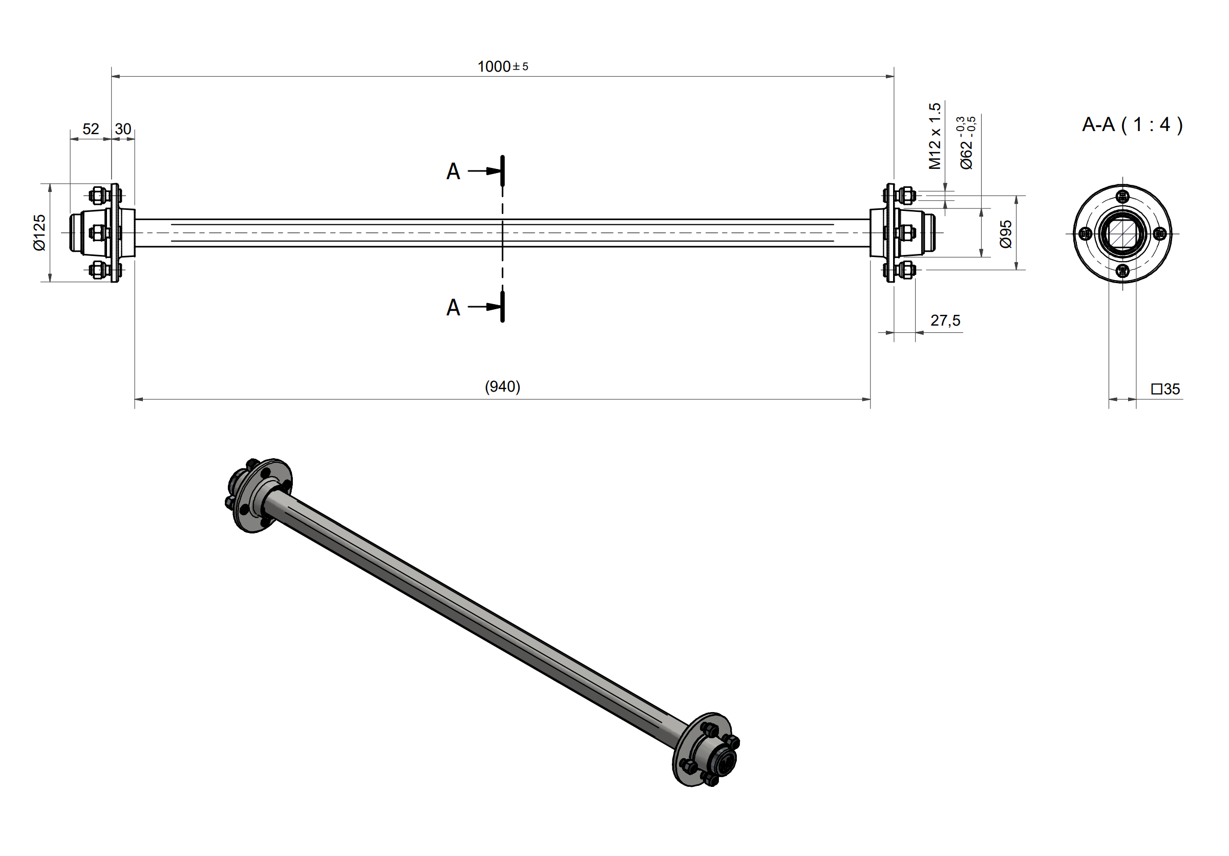 OSOVINA ZA PRIKOLICO 950kg BREZ ZAVOR (1000 mm)