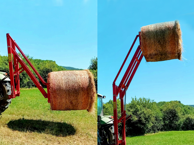 Stranka iz Hrvaške si je sama doma izdelala nakladalnik za bale, ki omogoča doseg na kar 3,7 m višine. Na tak način lahko v en stolp naloži kar nekaj bal in tako skrči površino, potrebno za skladiščenje bal.