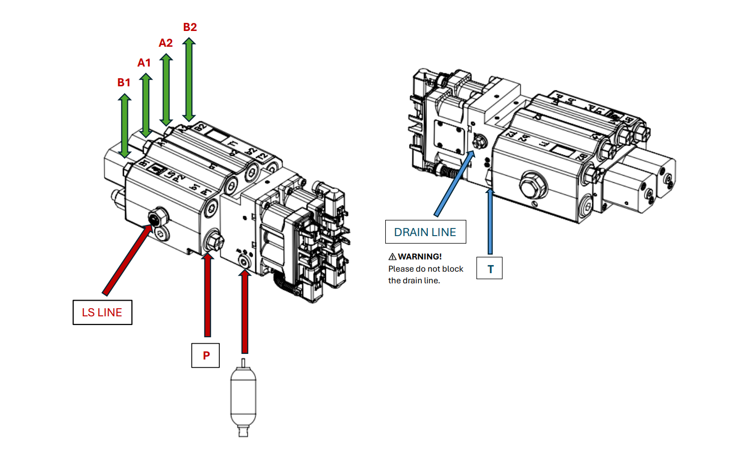 Tri hidravlične linije (P, T, P1) povezujejo LOAD SENSING proporcionalni ventil s hidravličnim sistemom traktorja: