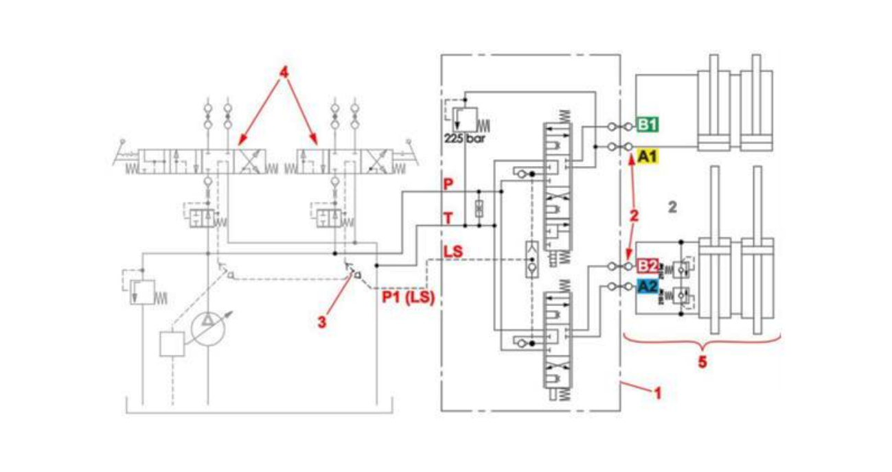 Shema prikazuje hidravlični sistem "LOAD SENSING":